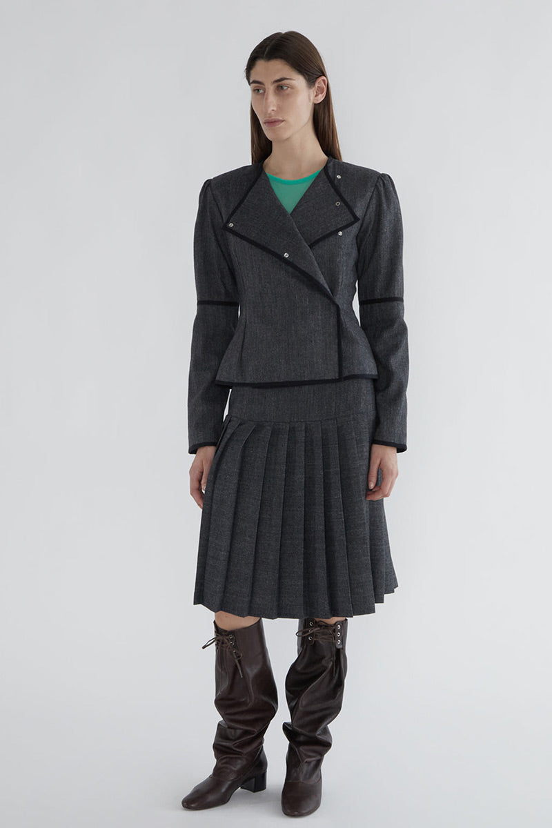 • 程よい厚みのウール混メランジ生地は、滑らかかつドライタッチな質感。