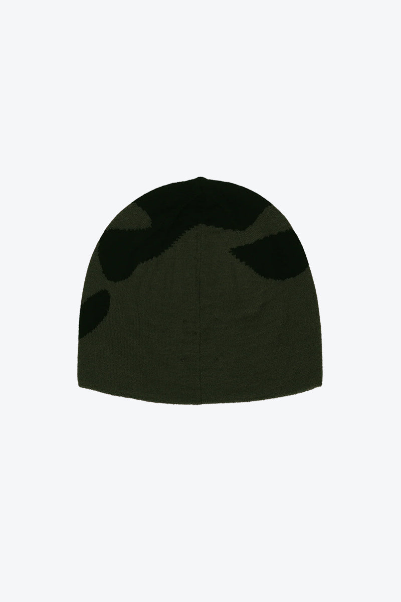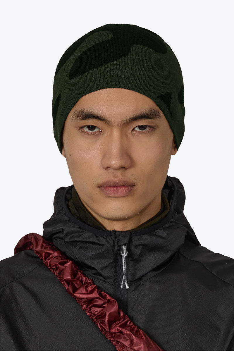 • 抽象的なデザインと色の切り替えが特徴のニットキャップ。