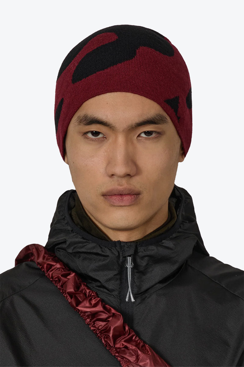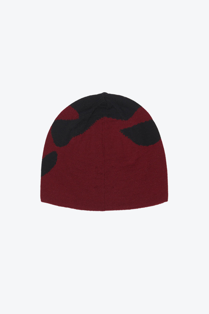 • 抽象的なデザインと色の切り替えが特徴のニットキャップ。