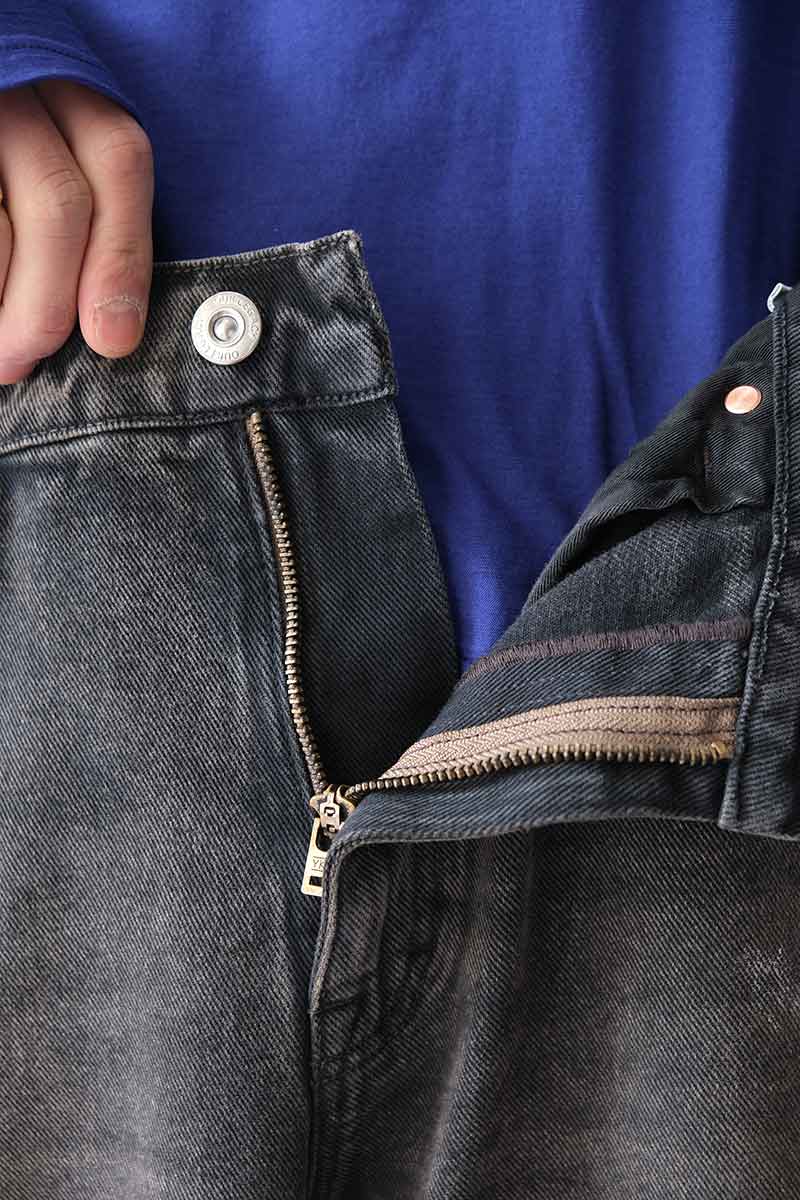• フロントはYKKジップフライ仕様、エンボス加工のラバーパッチもポイント。