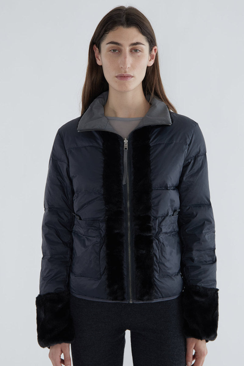 • 裏地は、光沢の強いナイロン生地とファーを組み合わせたエッジィなデザイン。