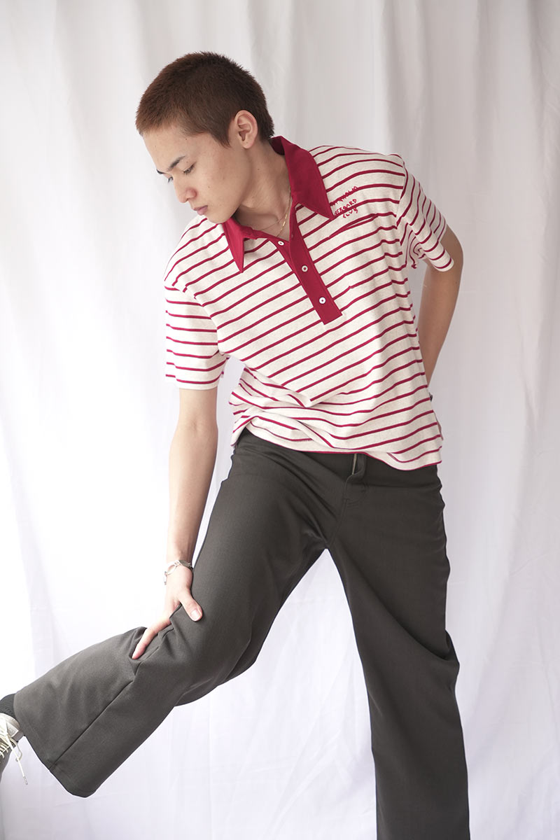 • 胸元のロゴ刺繍、レトロな配色のジャカード織りピンボーダーがヴィンテージ感のある仕上がり。
